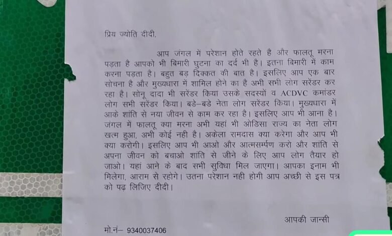 पत्र में यह भी लिखा गया है कि आत्मसमर्पण के बाद सरकार की ओर से सभी सुविधाएं दी जा रही हैं, इनाम राशि, सुरक्षा और पुनर्वास की गारंटी के साथ। उन्होंने लिखा, “यहां आने के बाद सभी सुविधा मिल जाएगी, इनाम भी मिलेगा, आराम से रहोगे, उतनी परेशानी नहीं होगी।”