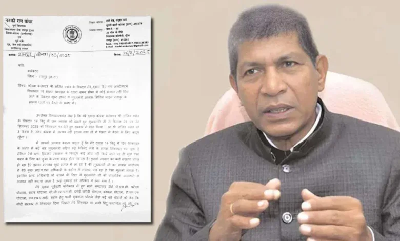 रायपुर। पूर्व गृहमंत्री ननकी राम कंवर ने कोरबा कलेक्टर अजीत वसंत को हटाने सीएम हाउस के सामने 4 अक्टूबर को धरना-प्रदर्शन करेंगे. इसके लिए उन्होंने रायपुर कलेक्टर गौरव सिंह को पत्र लिखकर अनुमति मांगी है. कंवर पहले ही कोरबा कलेक्टर को हटाने के लिए मुख्यमंत्री विष्णु देव साय के अलावा भाजपा प्रदेश अध्यक्ष को पत्र लिख चुके हैं.