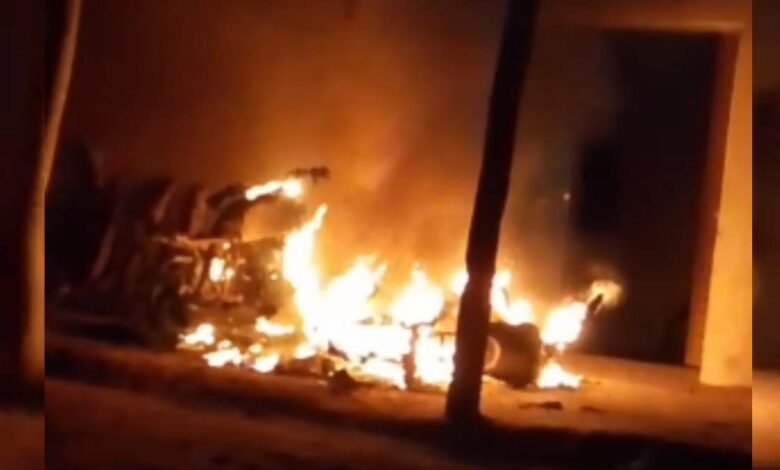 घर के बाहर खड़ी मोटरसाइकिलों में लगी आग