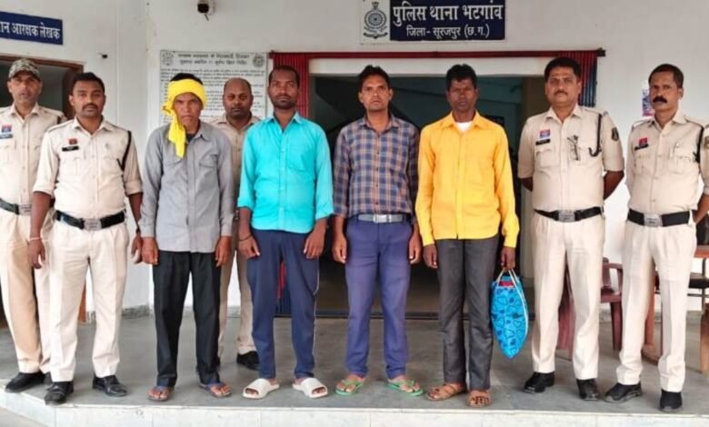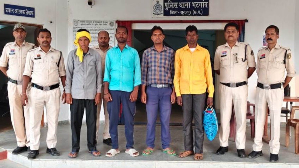 वहीं मामले की सूचना पर एसएसपी सूरजपुर प्रशांत कुमार ठाकुर ने आरोपियों की तलाश कर जल्द गिरफ्तार करने के निर्देश दिए। अतिरिक्त पुलिस अधीक्षक संतोष महतो और डीएसपी रितेश चौधरी के मार्गदर्शन में भटगांव पुलिस ने दबिश देकर चारों आरोपियों बज्जू मिंज (45 वर्ष), शिवा टोप्पो (56 वर्ष), जीवन लकड़ा (30 वर्ष) और दिरन टोप्पो (30 वर्ष) को गिरफ्तार किया।