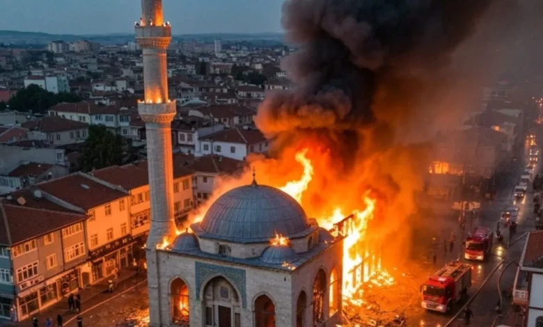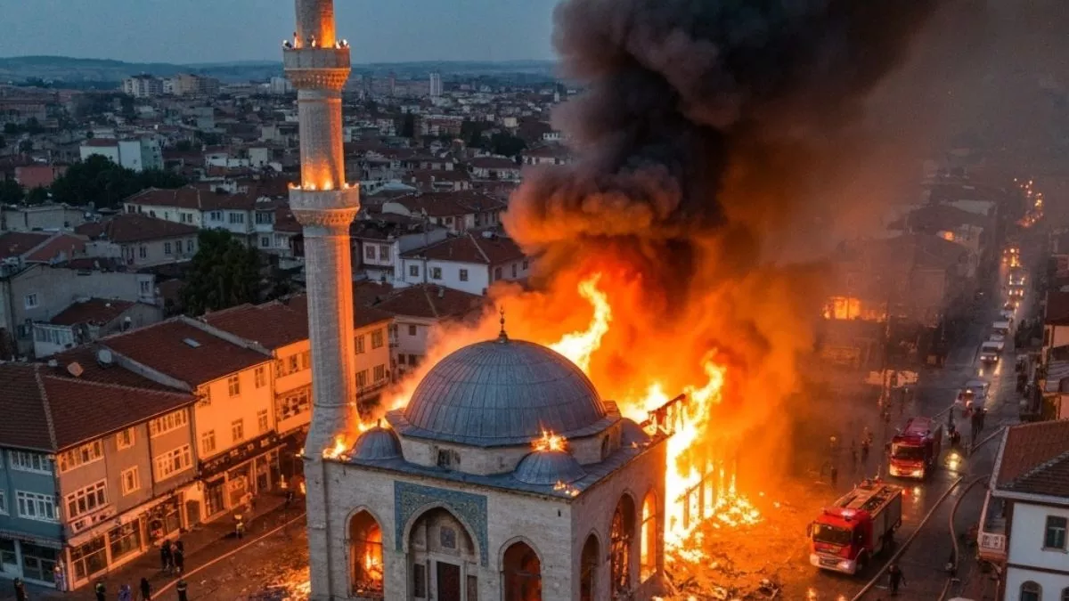 मस्जिद के एंट्री गेट पर उठीं आग की लपटें