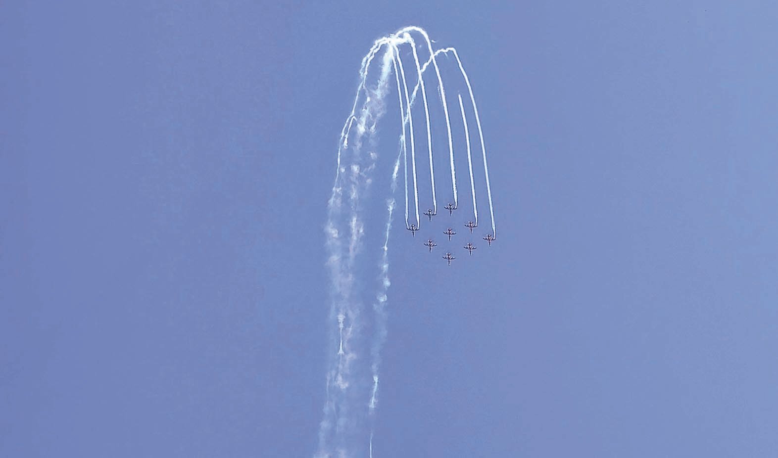 हरियाणा के हिसार में रविवार को भारतीय वायुसेना की सूर्यकिरण एरोबैटिक्स टीम ने अद्भुत एयर शो का प्रदर्शन किया। इस दौरान हिसार के महाराजा अग्रसेन हवाई अड्डे पर आसमान तिरंगे के रंग में रंग गया। भारतीय वायुसेना की सूर्य किरण टीम ने अपने हैरतअंगेज हवाई करतबों से शहरवासियों का दिल जीत लिया। इस शानदार एयर शो का शुभारंभ हरियाणा के मुख्यमंत्री नायब सिंह सैनी ने किया। सुबह से ही लोग इस रोमांचक पल का इंतजार कर रहे थे। 9 हॉक टी-1 फाइटर जेट्स ने जैसे ही उड़ान भरी, दर्शकों की नजरें आसमान में टिकी रह गईं। सुबह आठ बजे से ही लोग एयर शो देखने के लिए हवाई अड्डे पर जुटने लगे थे। करीब साढ़े 10 बजे जब सूर्य किरण टीम के नौ लड़ाकू विमानों ने आसमान में उड़ान भरी, तो उनकी गर्जना से पूरा शहर गूंज उठा। लोग अपने घरों की छतों पर चढ़ गए और इन खास पलों को अपने मोबाइल फोन में कैद करने लगे।