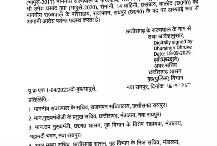 रायपुर। छत्तीसगढ़ में राज्यपाल के परिसहाय में बदलाव किया गया है। 2020 बैच के आईपीएस अधिकारी उमेश गुप्ता को राज्यपाल का नया एडीसी नियुक्त किया गया है। वह आईपीएस सुनील कुमार शर्मा के स्थान पर यह पद संभालेंगे। इस संबंध में गृह विभाग की ओर से आदेश भी जारी कर दिया गया है।
