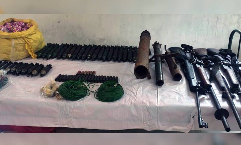 बीजीएल लांचर-2, 12 बोर- 2, एयरगन- 1, डायरेक्शन आईईडी-3, टिफिन आईईडी लगभग 5 किग्रा-1, बीजीएल बम-30, 12 बोर राउण्ड -26, बारुद प्लास्टिक पैकेट मे लगभग 2 किग्रा, मल्टी मीटर-1, पटाखा-12 पैकेट, बिजली वायर-2 बंडल, पोच-2, स्पिलंटर – 1 पैकेट