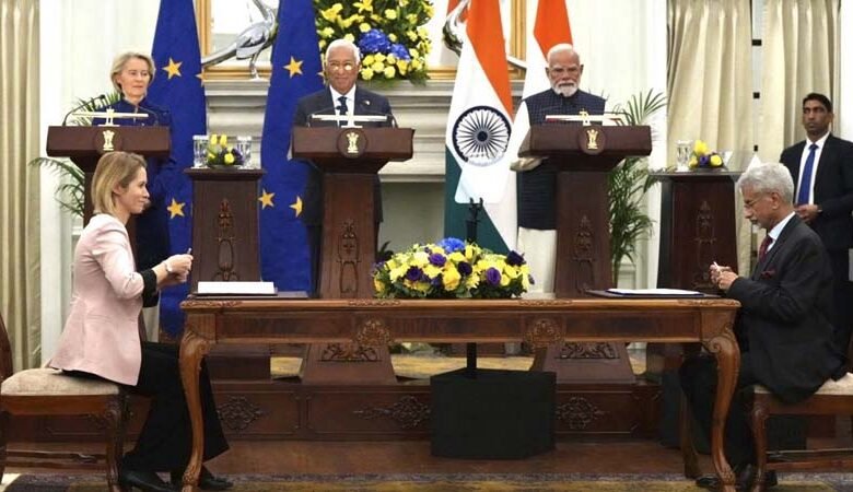 नई दिल्ली। प्रधानमंत्री नरेन्द्र मोदी ने कहा है कि भारत ने यूरोपीय संघ के 27 देशों के साथ अपने इतिहास का अब तक का सबसे बड़ा मुक्त व्यापार समझौता किया है जो साझा समृद्धि का प्रारूप है। पीएम मोदी ने मंगलवार को यहां यूरोपीय परिषद के अध्यक्ष एंटोनियो कोस्टा और यूरोपीय आयोग की अध्यक्ष उर्सुला वान डेर लेयेन के साथ 16 वें भारत- ई यू शिखर सम्मेलन के बाद संयुक्त वक्तव्य में कहा कि यह एक ऐतिहासिक अवसर है जब विश्व की दो सबसे बड़ी लोकतांत्रिक शक्तियां अपने संबंधों में निर्णायक अध्याय जोड़ रही हैं। उन्होंने कहा कि पिछले कुछ वर्षों में भारत और यूरोपीय संघ के संबंधों में उल्लेखनीय प्रगति हुई है।
